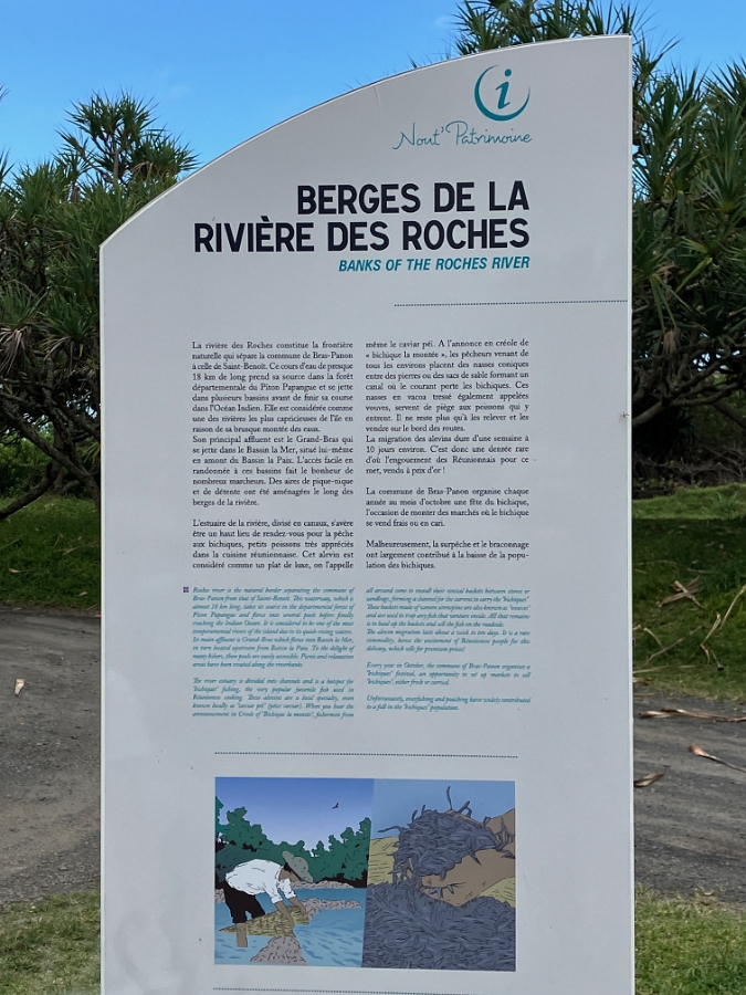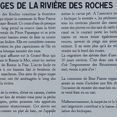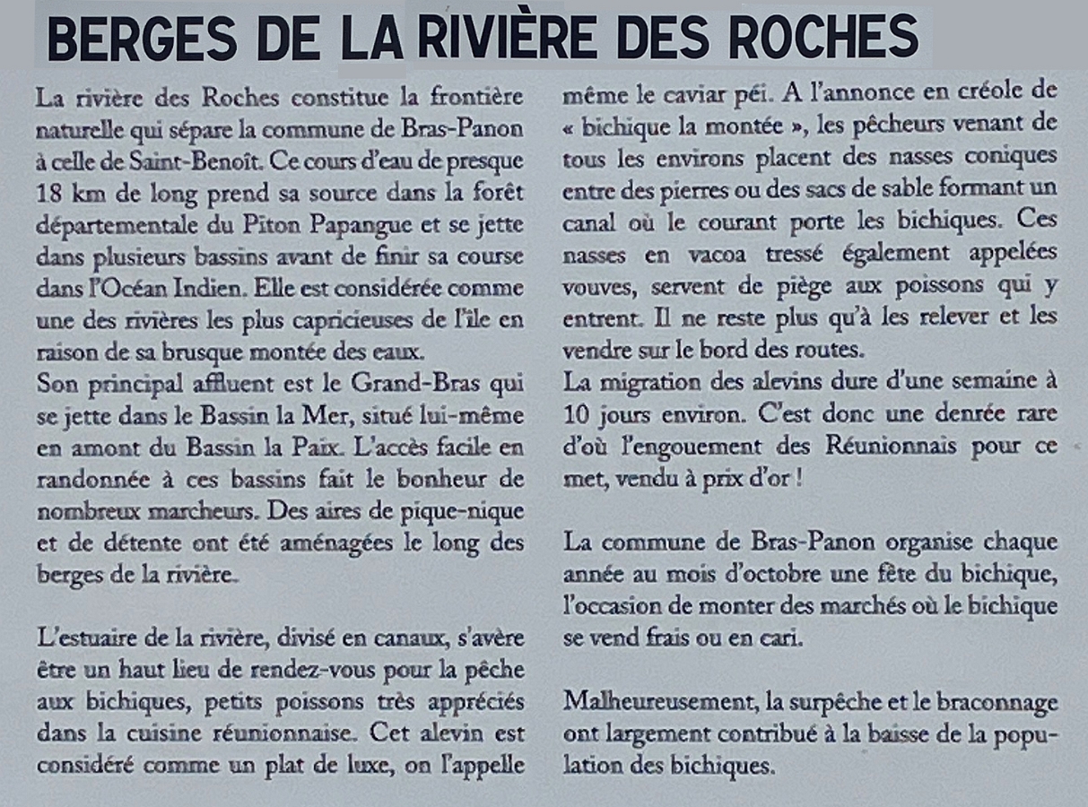 La Rivière des Roches est une des rivières les plus tumultueuses de La Réunion. Elle est la frontière naturelle entre les villes de Bras Panon et de Saint-Benoît. Son embouchure est surtout réputé pour la « pêche bichiques ». Parce que c’est l’endroit où les alevins des cabots-bouche-ronde, fameuses bichiques, ont mystérieusement choisi de remonter la rivière. Et c’est surtout là que les pêcheurs ont préparé leurs pièges, des nasses ou vouves, positionnées dans les canaux préalablement fabriqués à l’aide de galets de rivière.